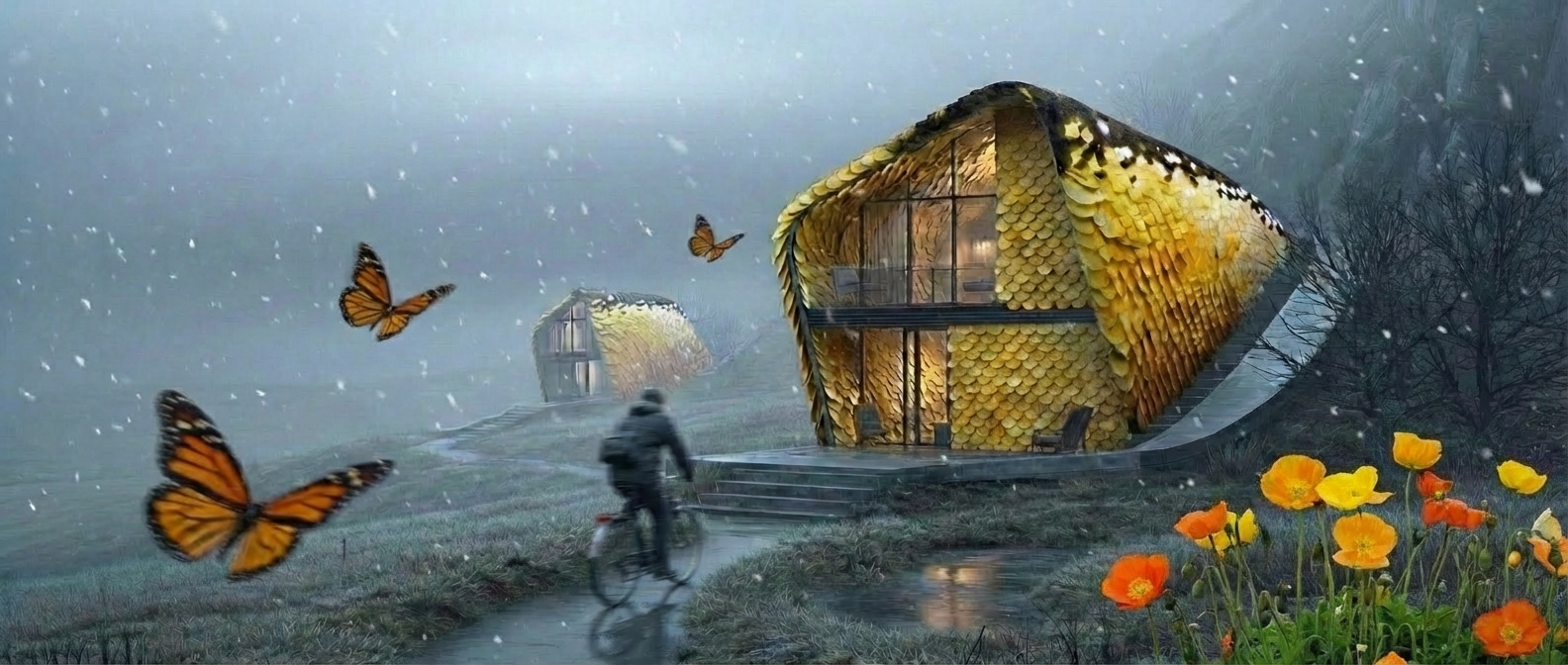Where diffusion-driven AI alchemy truly emerges is in our newfound ability to hybridize— blending architectural typologies, design languages, and planning logics into spatial propositions that resist conventional categorization. In this expanded design space, a building no longer needs to belong cleanly to a single type; instead, it can evolve as a composite system, shaped by multiple influences at once. This approach draws a similarity to biomimicry, where nature never operates within fixed typologies. Natural systems overlap, adapt, mutate, and co-evolve, producing forms that are both efficient and deeply responsive to their environment. In the same way that life forms draw from climate, terrain, available resources, and ecological relationships, architecture should emerge from its geographic, environmental, and cultural context.