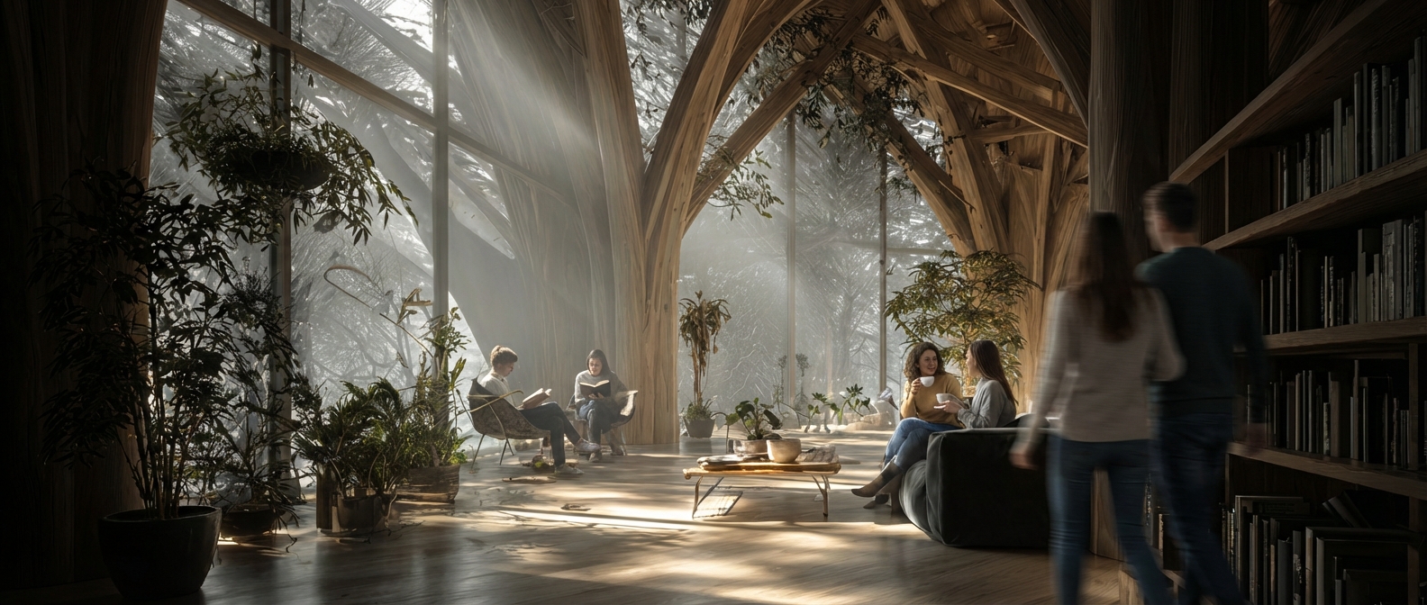 When visualization takes only minutes, the constraints on the designer’s imagination are erased. Design teams are freed to focus on higher-value work: critical thinking, spatial reasoning, and experiential intent. We can test more radical ideas, iterate with less penalty, and pair visual exploration with parametric and simulation-based tools that evaluate biophilic performance—daylight penetration, views to nature, material tactility, airflow, thermal comfort, and patterns of movement informed by natural systems. AI-assisted visualization allows these complex, often non-orthogonal forms and spatial relationships to be seen and understood early, rather than simplified or deferred due to representational limits.